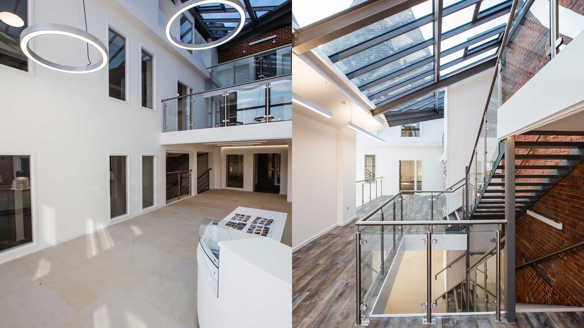 We have created a fashionable ‘de-furbished’ warehouse style office space, featuring exposed brick walls, beams and original columns. An impressive central atrium links all the suites, with new rooflights and lightwells to bring in floods of light to the core of the building. LED light fixtures have been used throughout, including some attractive feature lighting.